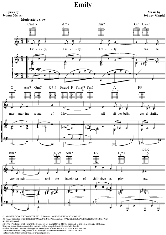 Digital Sheet Music for Emily by Johnny Mercer, Johnny Mandel scored for Piano/Vocal/Chords; id:111362