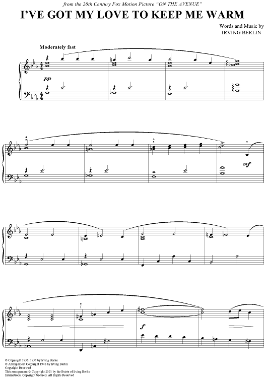Digital Sheet Music for I've Got My Love to Keep Me Warm by Frank Sinatra, Irving Berlin, Billie Holiday, Ella Fitzgerald, Mildred Bailey, Dean Martin, Benny Goodman, Les Brown scored for Piano Solo; id:371936