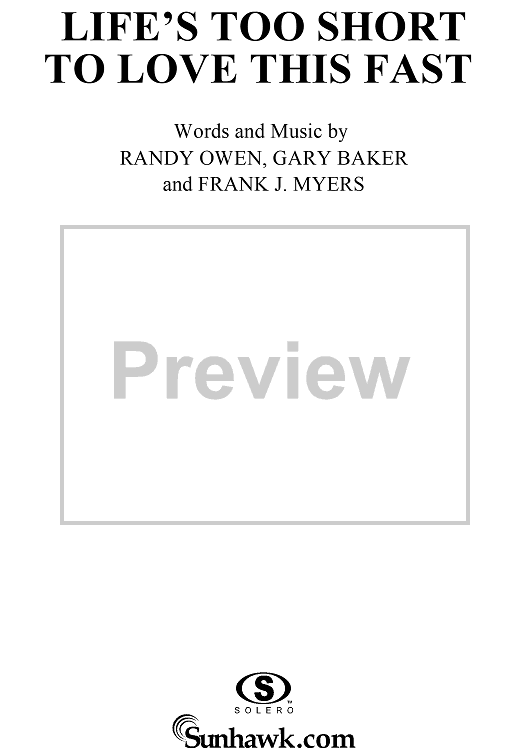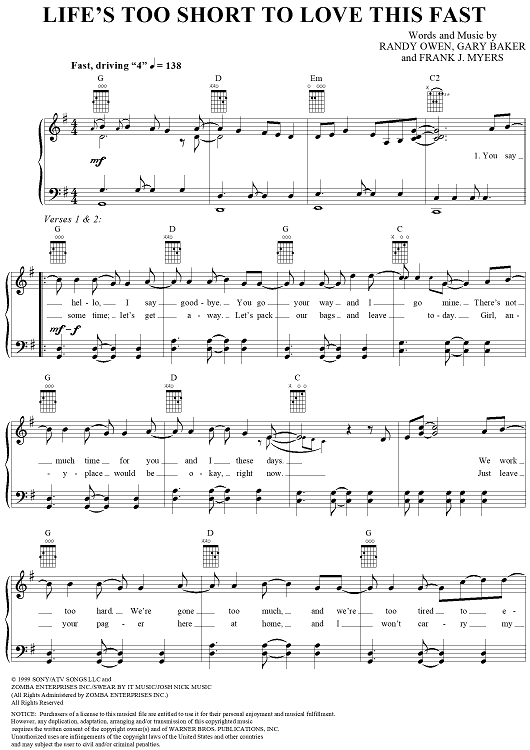 Digital Sheet Music for Life's Too Short to Love This Fast by Gary Baker, Frank Myers, Randy Owen, Alabama scored for Piano/Vocal/Chords; id:216715