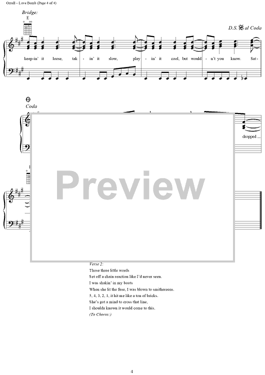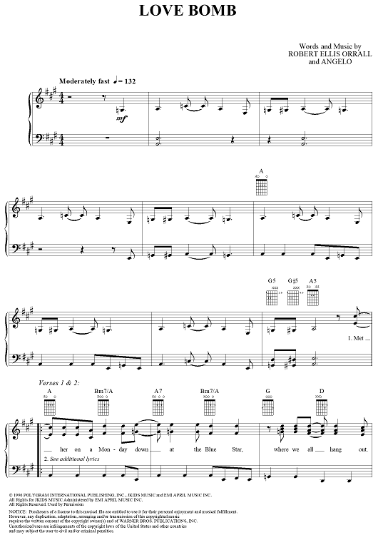 Digital Sheet Music for Love Bomb by Kevin Sharp, Robert Ellis Orrall, Angelo Petraglia scored for Piano/Vocal/Chords; id:203477