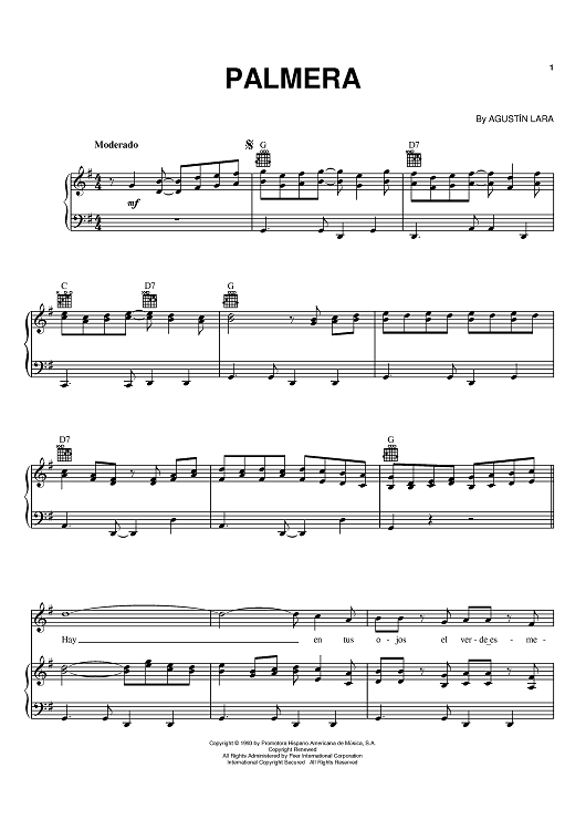 Digital Sheet Music for Palmera by Agustin Lara scored for Piano/Vocal/Chords; id:371796