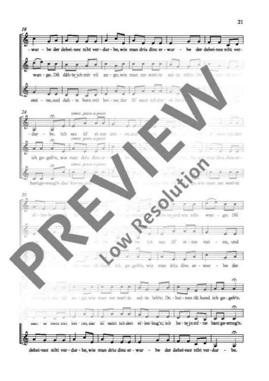 Pascal Martinés Sammlung von „Vier Weisen für vierstimmigen Frauenchor a cappella“ (SSAA), die nach dem Titel des ersten Liedes Under der linden benannt ist, liegen Dichtungen des Walther von der Vogelweide zugrunde. Dem Mainzer (Chor-)Pädagogen und Komponist gelingt es hier nicht nur, die verschiedenen inhaltlichen Facetten dieser mittelalterlichen Minnedichtungen musikalisch aufzublättern. Er bedient sich zugleich auch einer schwungvollen Tonsprache, die in Motivik und Harmonik an die Musik des Mittelalters erinnert, ohne dabei jedoch auch nur einen Moment lang unmodern daherzukommen. Diese vier weltlichen Frauenchorkompositionen sind für ambitionierte Laienchöre gut machbar. Einzige Klippe dürfte – neben ein paar rhythmischen Finessen wie Taktwechseln und Duolen – die Aussprache der mittelhochdeutschen Sprache sein. Eine beigefügte Aussprachehilfe liefert hier aber ideales Trainingsmaterial.