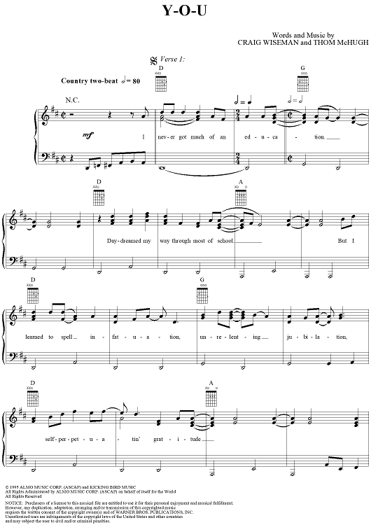 Digital Sheet Music for Y-O-U by Craig Wiseman, Neal McCoy, Thom McHugh scored for Piano/Vocal/Chords; id:241849