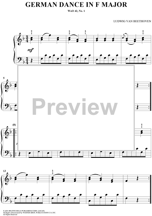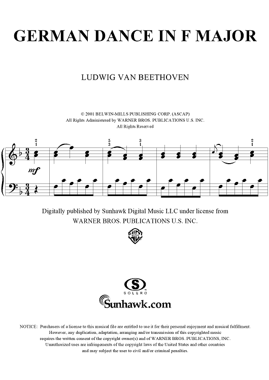Digital Sheet Music for German Dance in F Major, WoO42, No. 1 by Ludwig van Beethoven, Donald Beattie, Delayna Beattie scored for Easy Piano; id:297640