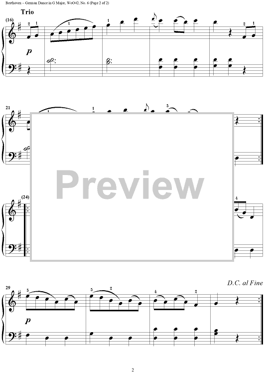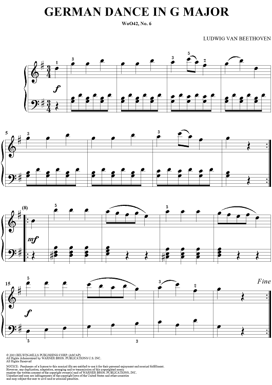 Digital Sheet Music for German Dance in G Major, WoO42, No. 6 by Ludwig van Beethoven, Donald Beattie, Delayna Beattie scored for Easy Piano; id:297644