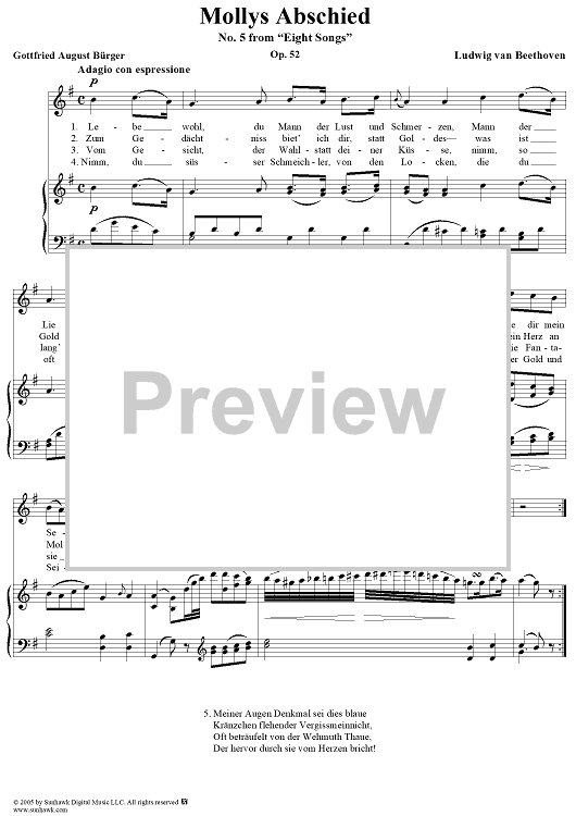 Digital Sheet Music for Mollys Abschied, No. 5 from "Eight Songs", Op. 52 by Ludwig van Beethoven, Bürger scored for Voice/Piano; id:315429