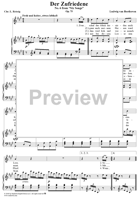 Digital Sheet Music for Six Songs, Op. 75, No. 6: Der Zufriedene by Ludwig van Beethoven, Chr. L. Reissig scored for Voice/Piano; id:315425