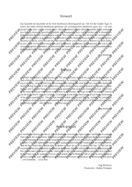 I consider Beethoven’s String Quartet op. 130 with its Grosse Fuge as the pinnacle of all quartets. In each of the four movements, Beethoven succeeds in re-inventing the archetypal movement forms with equal intensity, meaning that they are consequently nothing like what they once were. My Beethoven Studies (String Quartets 6-10) explore the cosmos of this so very unique quartet to a greater or lesser degree, and in explicit form in this concluding quartet of the cycle. The Cavatina from op. 130 is one of the most emotional movements ever written by Beethoven. Although some of the original material can be recognised in my own Cavatina, I consider it as one of the most personal and freest movements of my entire quartet cycle. This is a free form of ardent singing and flowing, marking the conclusion of the cycle which grappled so vehemently and sensuously with the cosmos of Beethoven’s quartets. Everything hovers … into the open … into free space. Jörg Widmann