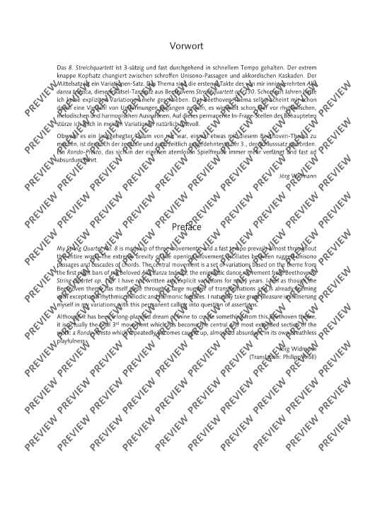 My String Quartet No. 8 is made up of three movements, and a fast tempo prevails almost throughout the entire work. The extreme brevity of the opening movement oscillates between rugged unisono passages and cascades of chords. The central movement is a set of variations based on the theme from the first eight bars of my beloved Alla danza tedesca, the enigmatic dance movement from Beethoven’s String Quartet op. 130. I have not written any explicit variations for many years. I feel as though the Beethoven theme has itself gone through a large number of transformations and is already teeming with exceptional rhythmic, melodic and harmonic features. I naturally take great pleasure in immersing myself in my variations with this permanent calling into question of assertions. Although it has been a long-planned dream of mine to create something from this Beethoven theme, it is actually the final 3rd movement which has become the central and most extended section of the work: a Rondo-Presto which repeatedly becomes caught up, almost ad absurdum, in its own breathless playfulness. Jörg Widmann