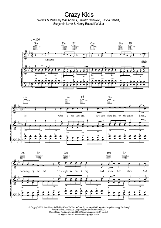 Digital Sheet Music for Crazy Kids by will.i.am, Kesha, Benjamin Levin, Kesha Sebert, Lukasz Gottwald, Henry Russell Walter scored for Piano/Vocal/Chords; id:436968
