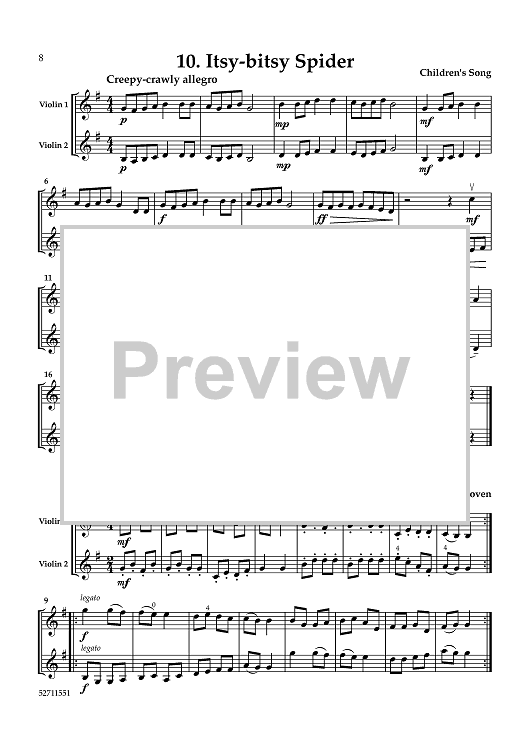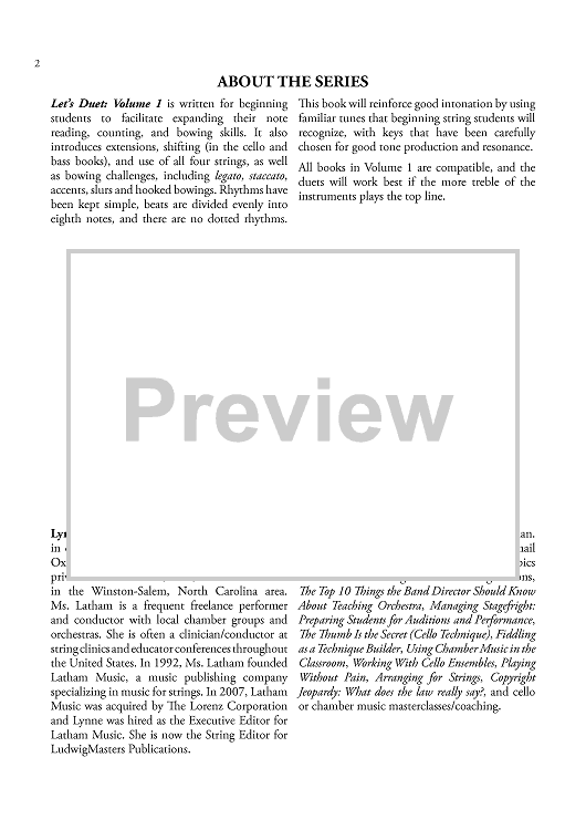 This collection includes beginning level duets compatible for violin, viola, cello, and bass. Learn simple rhythms, basic bow skills, and solid intonation with familiar children's and classic tunes. The arrangements work best with the more treble of the two instruments on top line. The violin and viola books remain in first position.