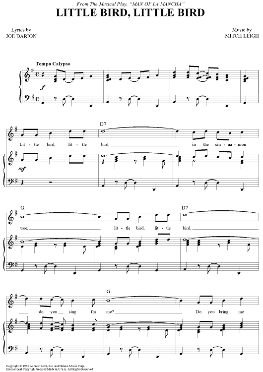 Digital Sheet Music for Little Bird, Little Bird by Mitch Leigh, Joe Darion scored for Piano/Vocal/Chords; id:437629