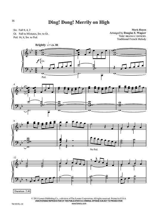 Digital Sheet Music for Ding! Dong! Merrily on High by Mark Hayes, Douglas Wagner, Traditional French Melody scored for Organ Solo; id:437248