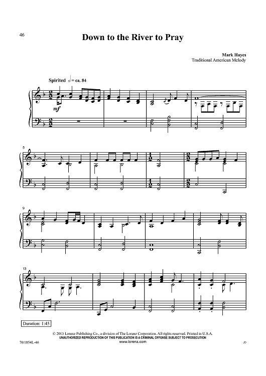 Digital Sheet Music for Down to the River to Pray by Mark Hayes, Traditional American Melody scored for Piano Solo; id:434767