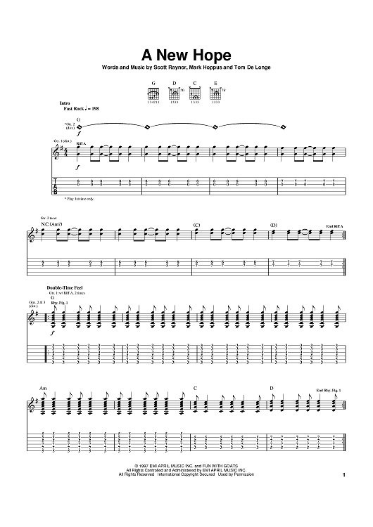 Digital Sheet Music for A New Hope by Mark Hoppus, blink-182, Tom DeLonge, Scott Raynor scored for Guitar Tab; id:370586