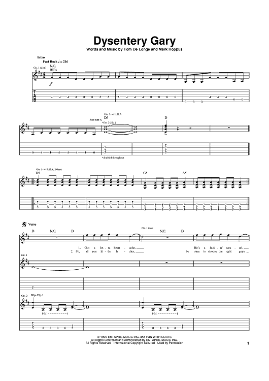 Digital Sheet Music for Dysentery Gary by Mark Hoppus, blink-182, Tom DeLonge scored for Guitar Tab; id:370593