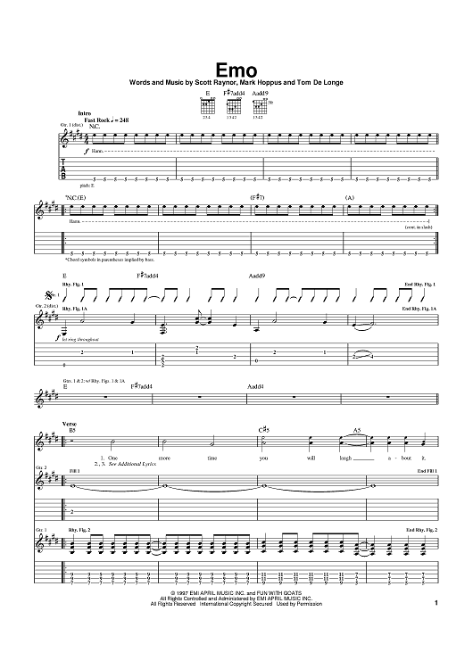 Digital Sheet Music for Emo by Mark Hoppus, blink-182, Tom DeLonge, Scott Raynor scored for Guitar Tab; id:370584
