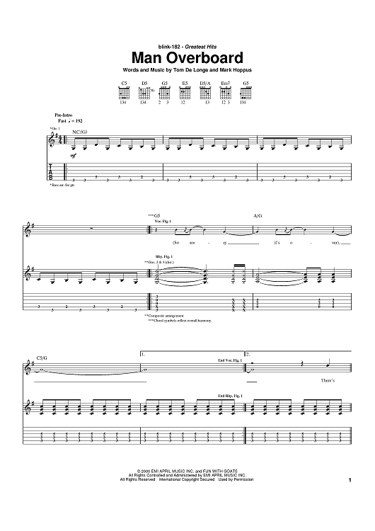Digital Sheet Music for Man Overboard by Mark Hoppus, blink-182, Tom DeLonge scored for Guitar Tab; id:370599