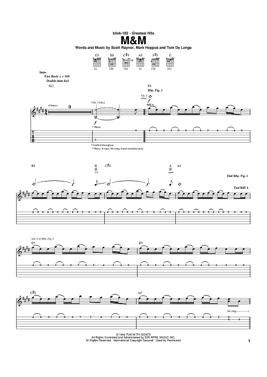 Digital Sheet Music for M&M by Mark Hoppus, blink-182, Tom DeLonge, Scott Raynor scored for Guitar Tab; id:389901