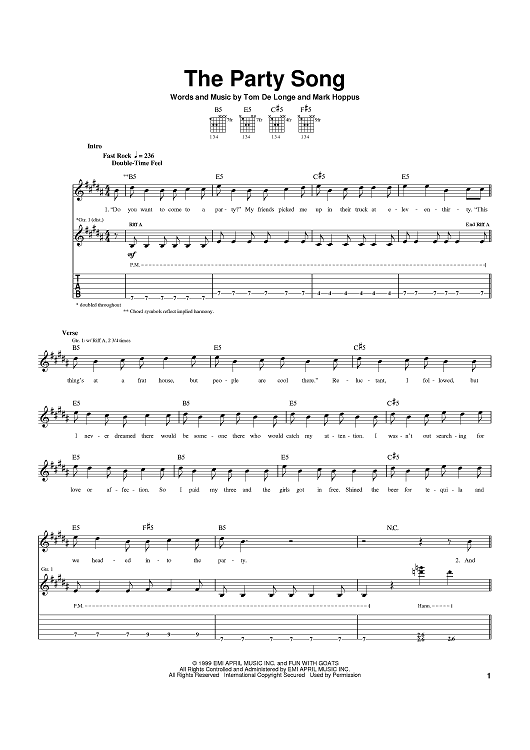 Digital Sheet Music for The Party Song by Mark Hoppus, blink-182, Tom DeLonge scored for Guitar Tab; id:370595