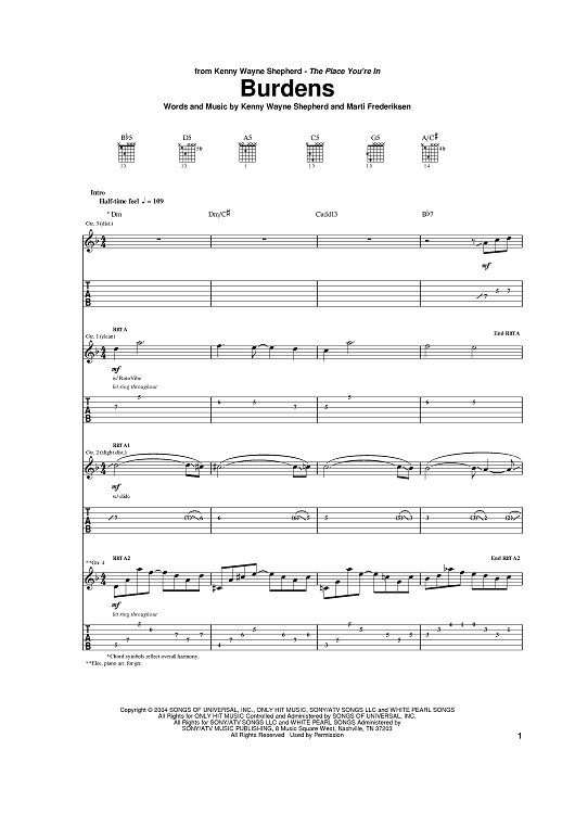 Digital Sheet Music for Burdens by Kenny Wayne Shepherd, Marti Frederiksen scored for Guitar Tab; id:383141