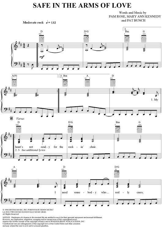 Digital Sheet Music for Safe In The Arms Of Love by Pat Bunch, Pam Rose, Mary Ann Kennedy, Martina McBride scored for Piano/Vocal/Chords; id:255927