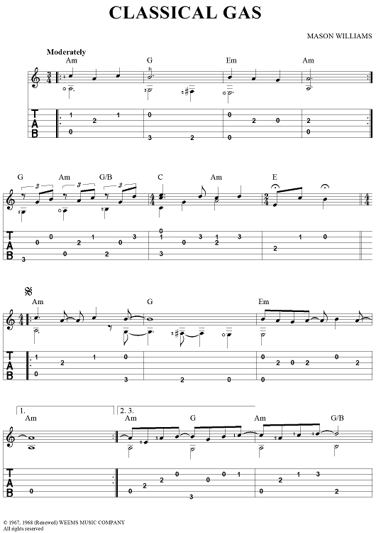 "Classical Gas" is an instrumental musical piece composed and originally performed by American guitarist Mason Williams with instrumental backing by members of the Wrecking Crew.