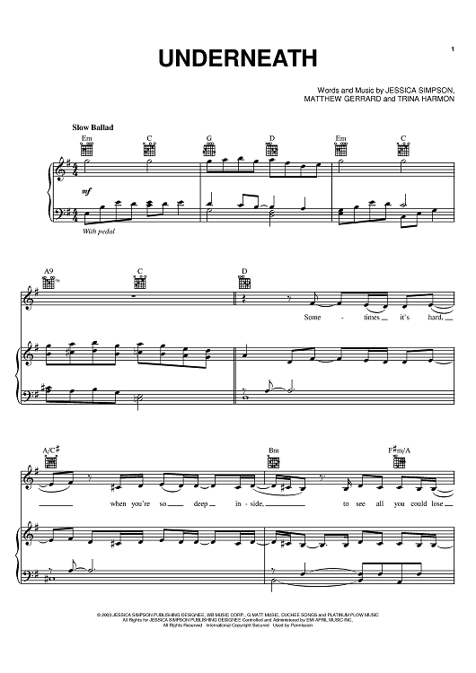 Digital Sheet Music for Underneath by Jessica Simpson, Matthew Gerrard, Trina Harmon scored for Piano/Vocal/Chords; id:374750