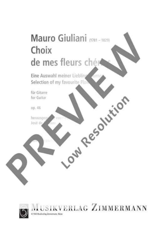 In "Choix de mes fleurs chéries" („Eine Auswahl meiner Lieblingsblumen“) beschreibt der lange Zeit in Wien ansässige italienische Gitarrenmeister Mauro Giuliani musikalisch 10 verschiedene Blumen in 10 Stücken. Es sind reizende Biedermeierstücke, die allerdings an den Gitarristen Ansprüche stellen, so dass sie als Prüfungsstück in der Mittelstufe eingestuft werden. Erleichtert wird die Ausführung durch die exakten Fingersatz- und Lagenbezeichnungen von José de Azpiazu (1912-1986), ein bekannter Gitarrist und Komponist in der 2. Hälfte des 20. Jahrhunderts.