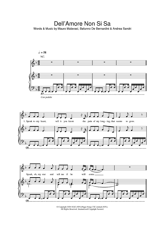 Digital Sheet Music for Dell'Amore Non Si Sa by Mauro Malavasi, Andrea Sandri, Bafunno De Bernardini, Hayley Dee Westenra scored for Piano/Vocal/Chords; id:389274