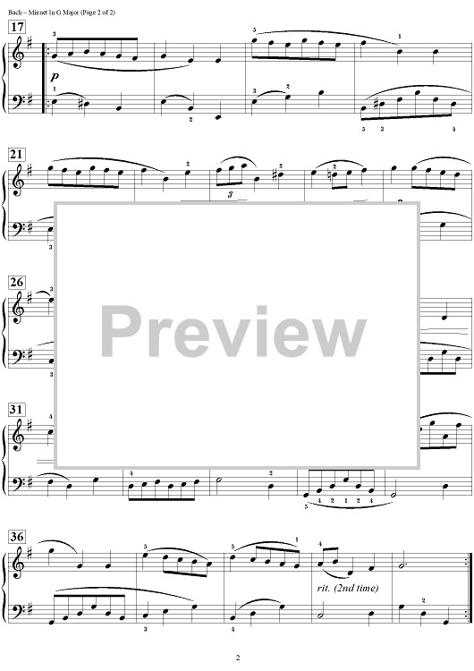 Digital Sheet Music for Minuet in G Major (Baroque) by Johann Sebastian Bach, Melody Bober scored for Piano; id:463409