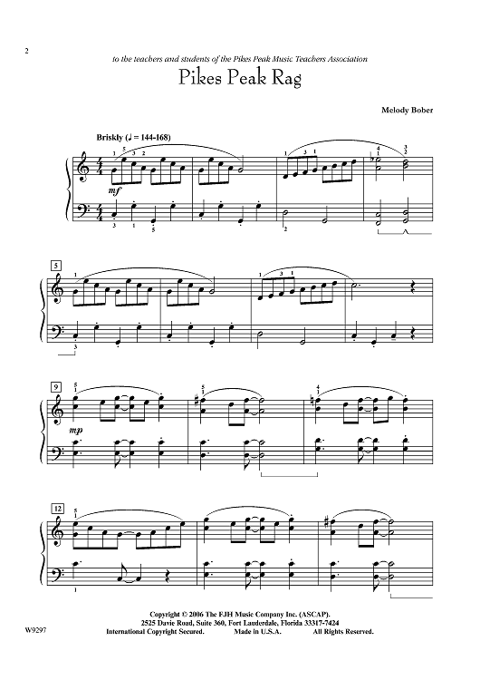 Pikes Peak Rag is a spirited and accessible ragtime style piece written in 4/4 time and in the key of C major. This piece consists of easy-to-learn patterns, simple syncopations, and a catchy melody that will sure to become a favorite ragtime solo in your studio.
