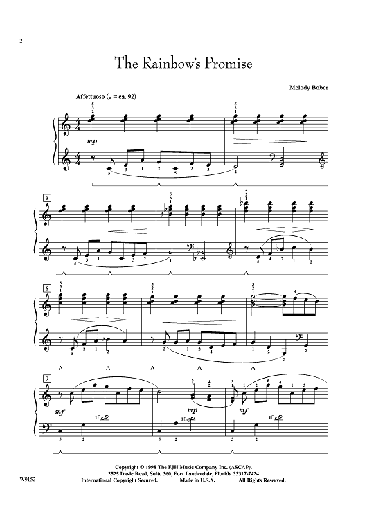 In The Rainbow’s Promise, Melody Bober exhibits her usual flair for beautiful, romantic solos. This enchanting composition features cross-hand passages, left-hand and right-hand melodies, while offering a variety of technical and musical challenges for the intermediate student.