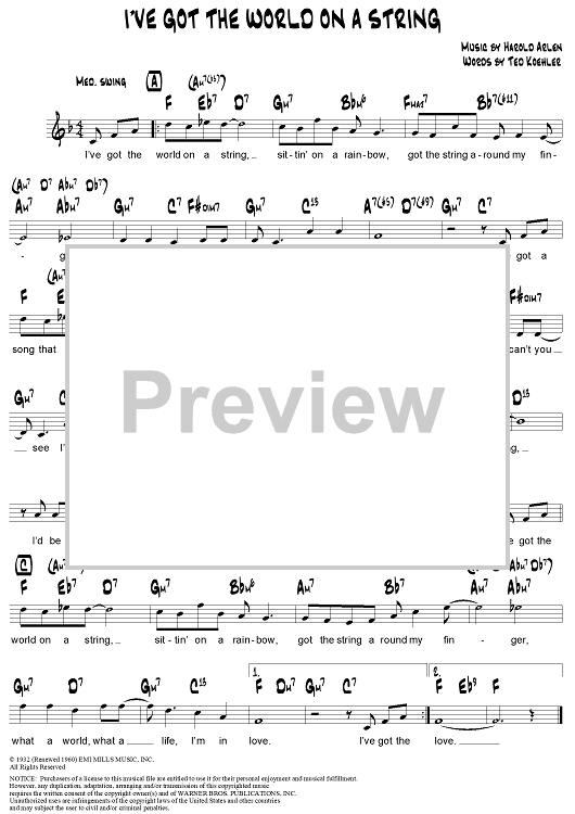 Digital Sheet Music for I've Got the World on a String by Harold Arlen, Frank Sinatra, Bing Crosby, Ted Koehler, Cab Calloway, Michael Buble, Dick Hyman scored for Lead Sheet; id:315463