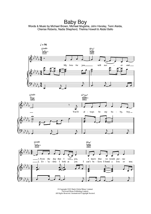 Digital Sheet Music for Baby Boy by Michael Brown, Big Brovaz, Michael Mugisha, John Horsley, Terri Aisida, Cherise Roberts, Nadia Shepherd, Thelma Howell, Abdul Bello scored for Piano/Vocal/Chords; id:378421