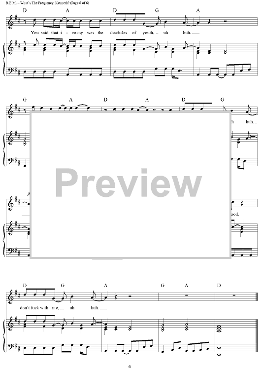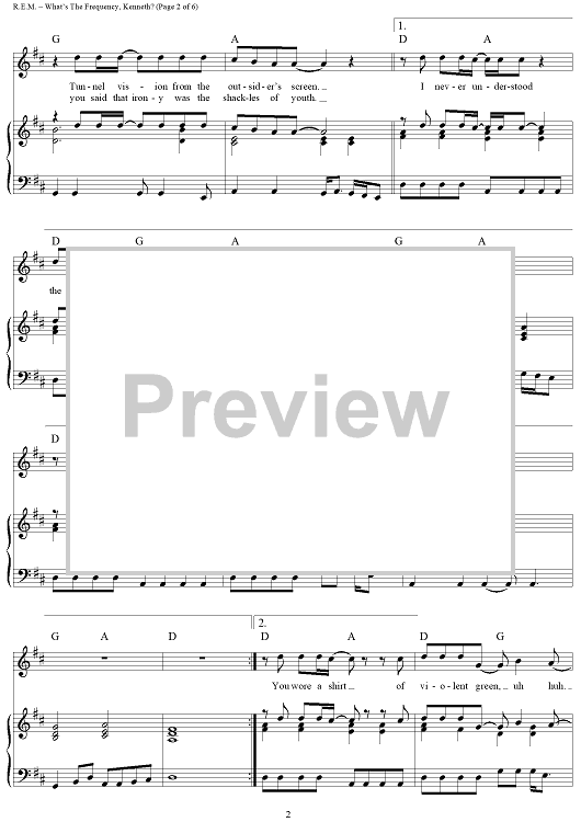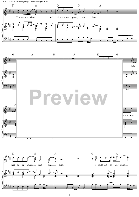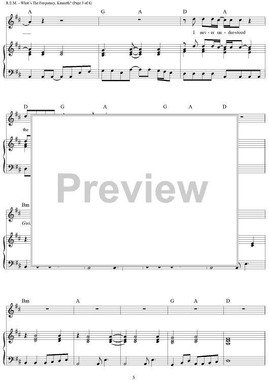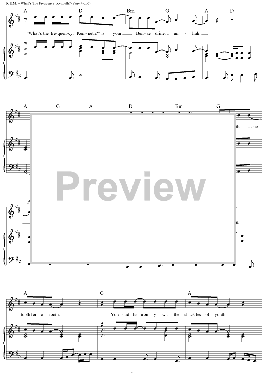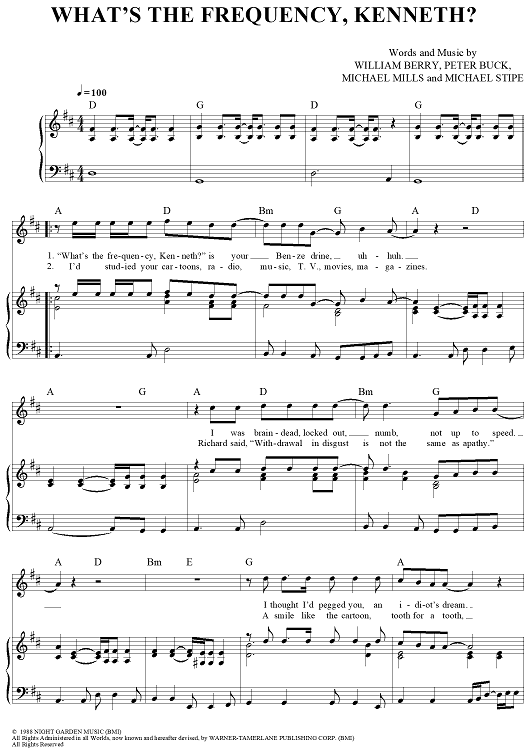 Digital Sheet Music for What's The Frequency, Kenneth? by R.E.M., William Berry, Michael Stipe, Peter Buck, Mike Mills scored for Piano/Vocal/Chords; id:433126