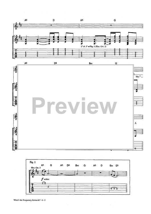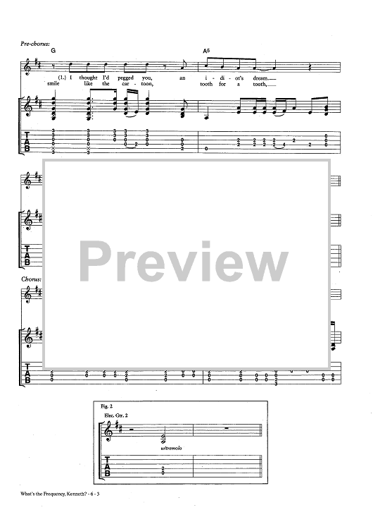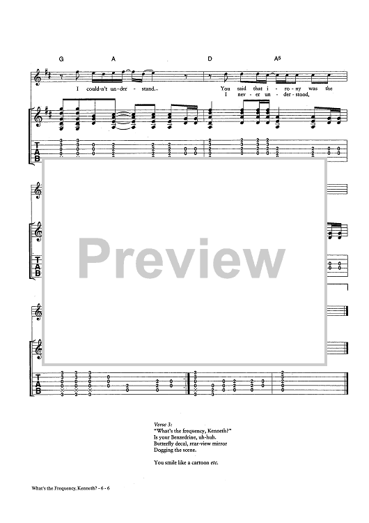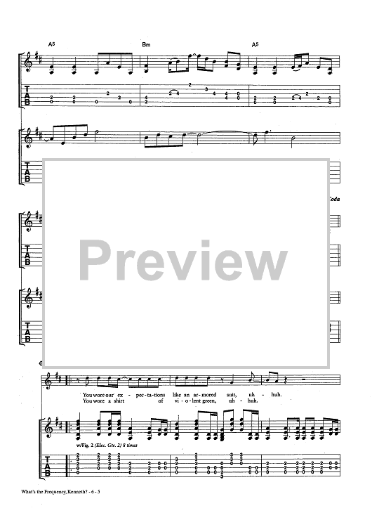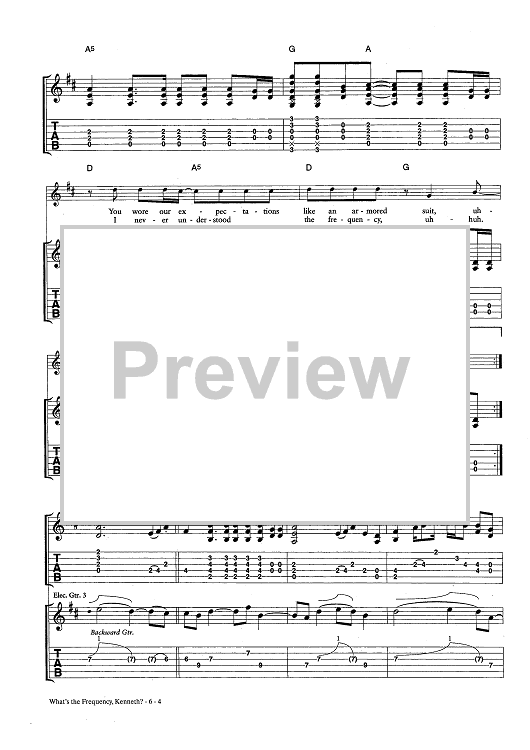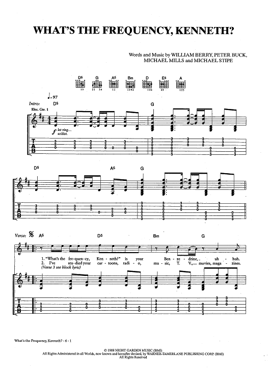Digital Sheet Music for What's The Frequency, Kenneth? by R.E.M., Michael Stipe, Peter Buck, Mike Mills, Bill Berry scored for Guitar Tab/Vocal/Chords; id:437002