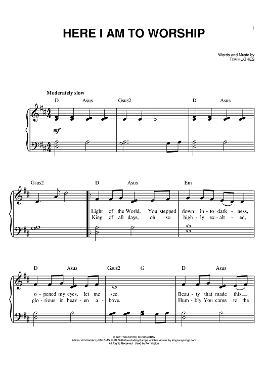 Digital Sheet Music for Here I Am To Worship by Michael W. Smith, Tim Hughes, Jeremy Camp, Sonicflood, Phillips, Craig and Dean scored for Easy Piano; id:379453