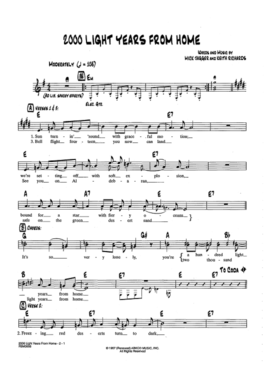Digital Sheet Music for 2000 Light Years From Home by Keith Richards, The Rolling Stones, Mick Jagger scored for Lead Sheet; id:437007