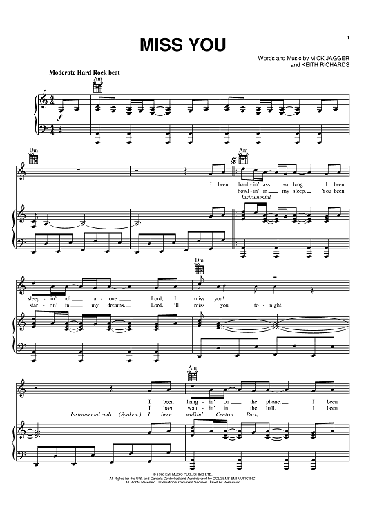 Digital Sheet Music for Miss You by Keith Richards, The Rolling Stones, Mick Jagger scored for Piano/Vocal/Chords; id:394519