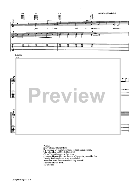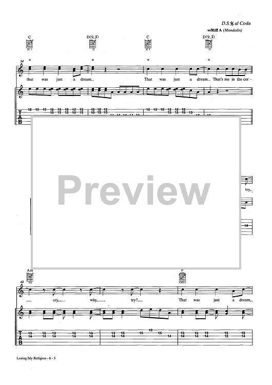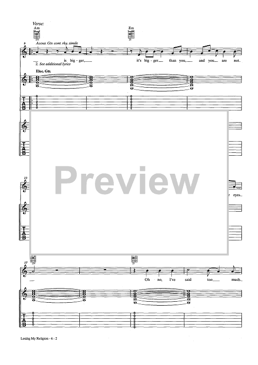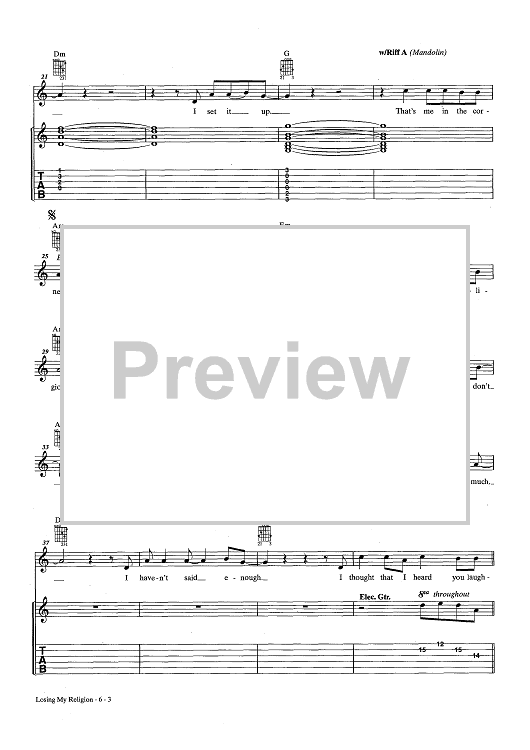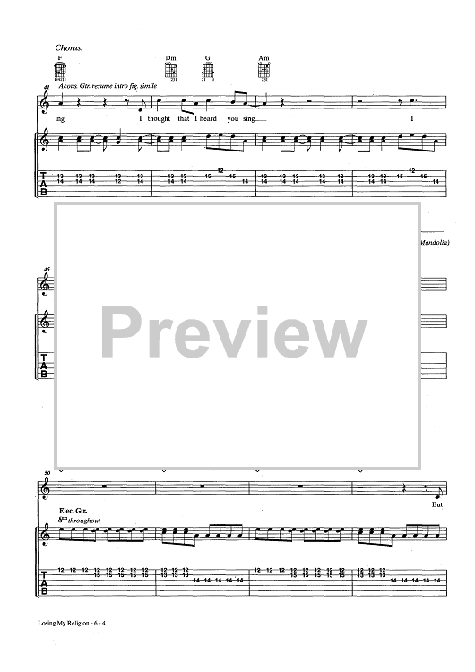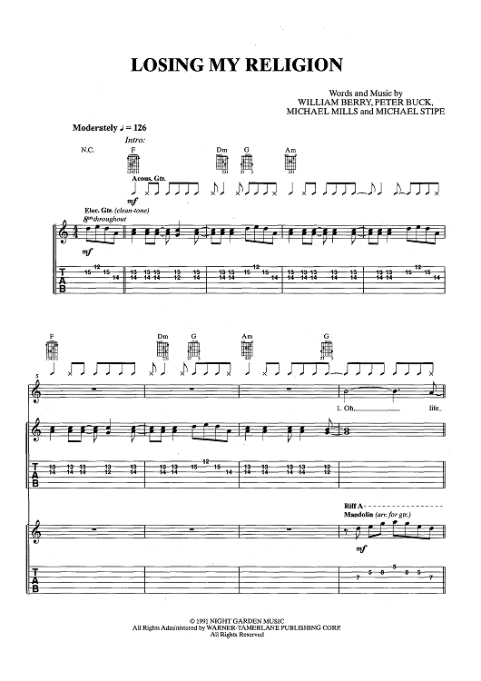Digital Sheet Music for Losing My Religion by R.E.M., Michael Stipe, Peter Buck, Mike Mills, Bill Berry scored for Guitar Tab/Vocal/Chords; id:436778