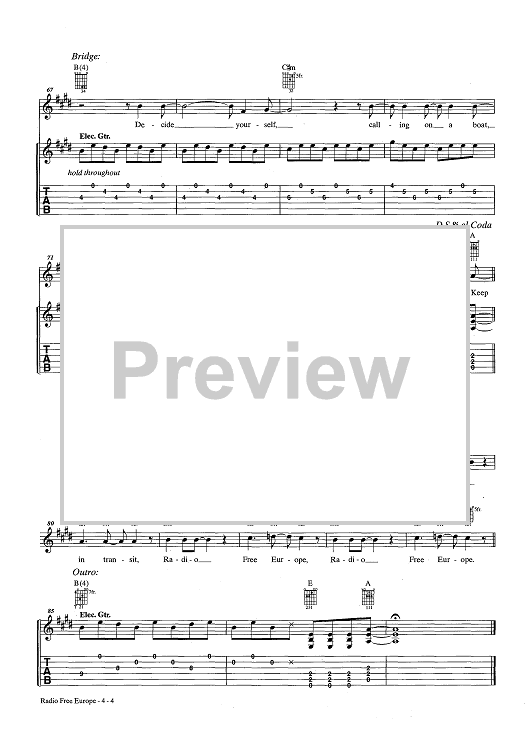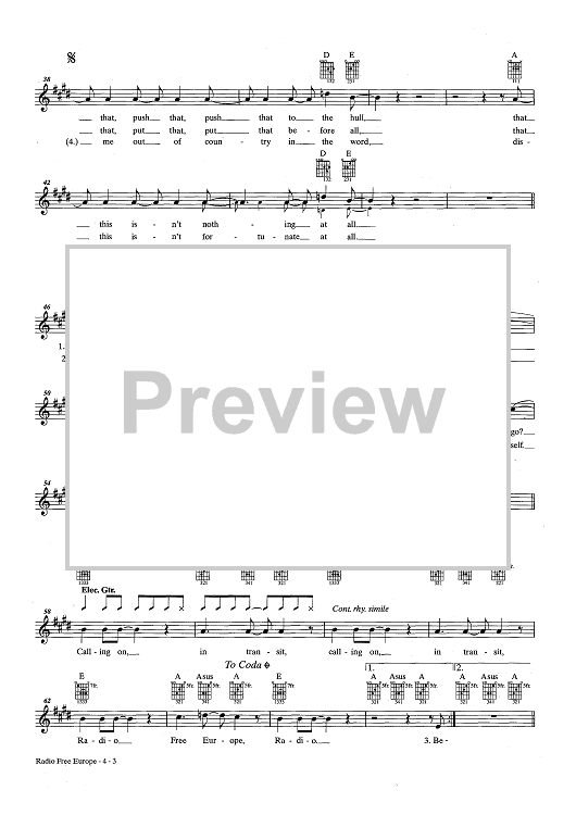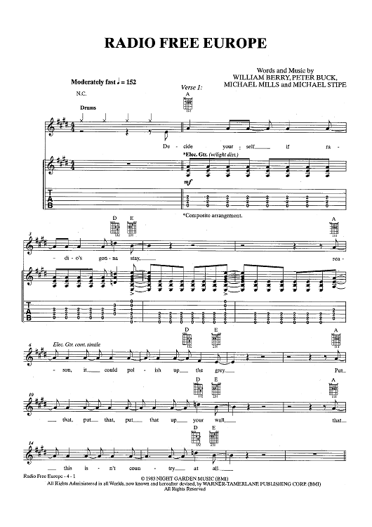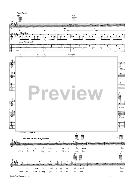 Digital Sheet Music for Radio Free Europe by R.E.M., Michael Stipe, Peter Buck, Mike Mills, Bill Berry scored for Guitar Tab/Vocal/Chords; id:436995