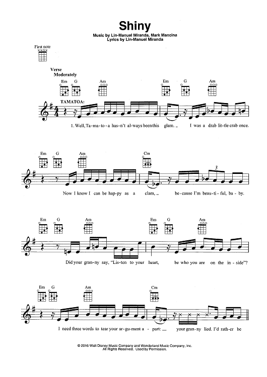 Digital Sheet Music for Shiny (from Moana) by Mark Mancina, Lin-Manuel Miranda scored for Ukulele; id:464997