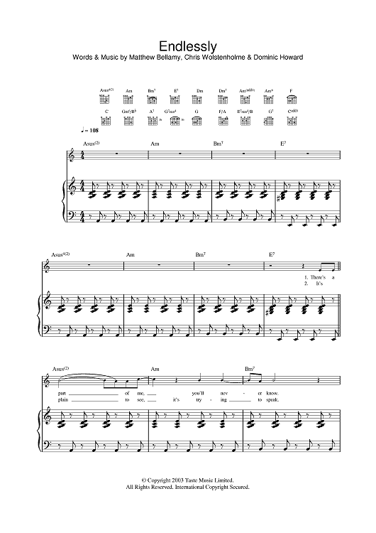 Digital Sheet Music for Endlessly by Matthew Bellamy, Dominic Howard, Muse, Chris Wolstenholme scored for Piano/Vocal/Chords; id:378261