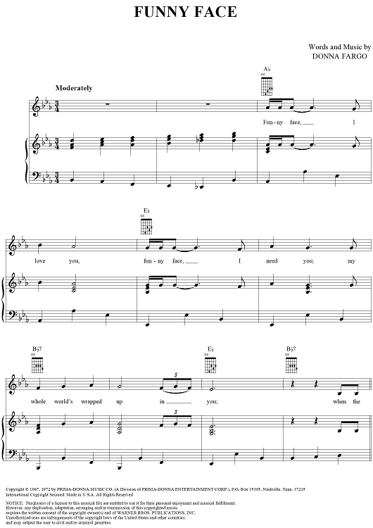 Digital Sheet Music for Funny Face by Donna Fargo scored for Piano/Vocal/Chords; id:203873