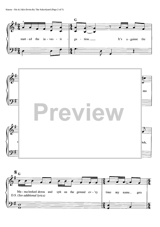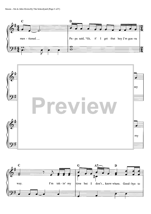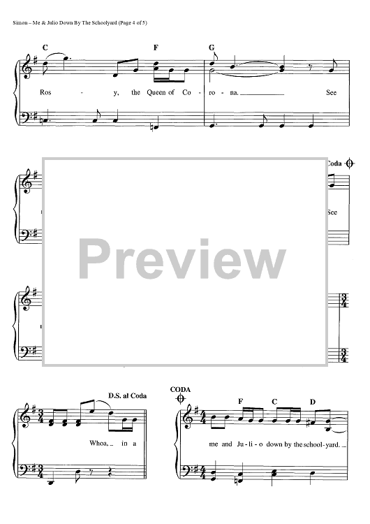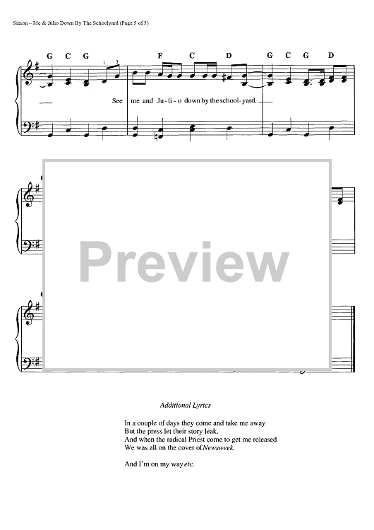 Digital Sheet Music for Me And Julio Down By The Schoolyard by Paul Simon scored for Easy Piano/Vocal/Chords; id:445029