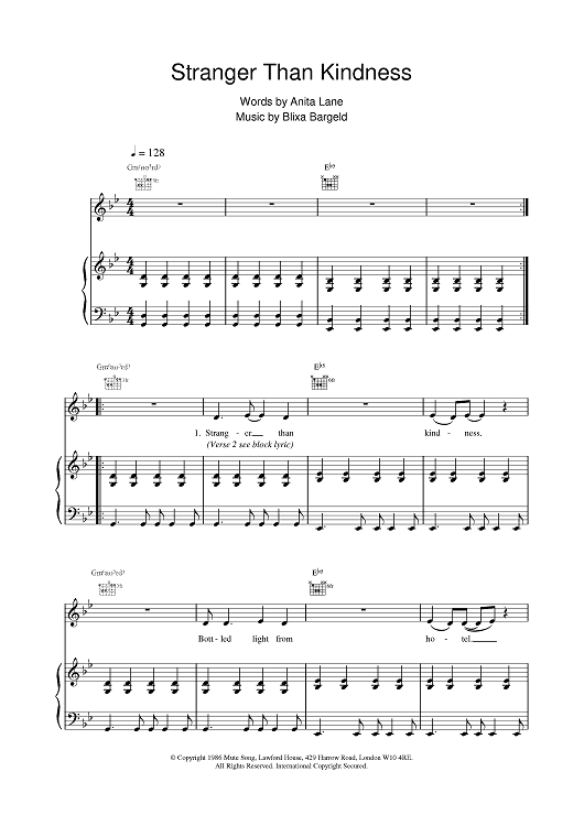 Digital Sheet Music for Stranger Than Kindness by Blixa Bargeld, Nick Cave, Anita Lane scored for Piano/Vocal/Chords; id:380081