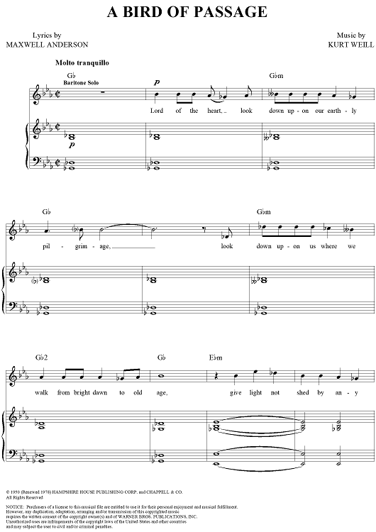 Digital Sheet Music for A Bird of Passage by Maxwell Anderson, Kurt Weill scored for Piano/Vocal/Chords; id:288498