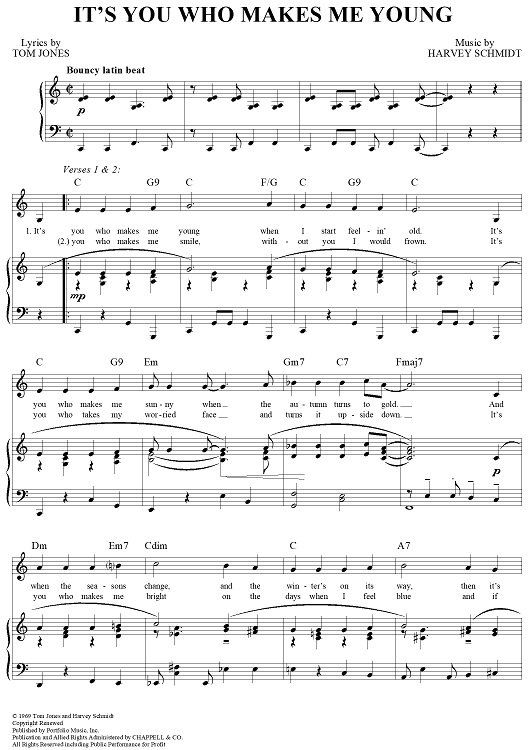 Digital Sheet Music for It's You Who Makes Me Young by Tom Jones, Harvey Schmidt scored for Piano/Vocal/Chords; id:304251