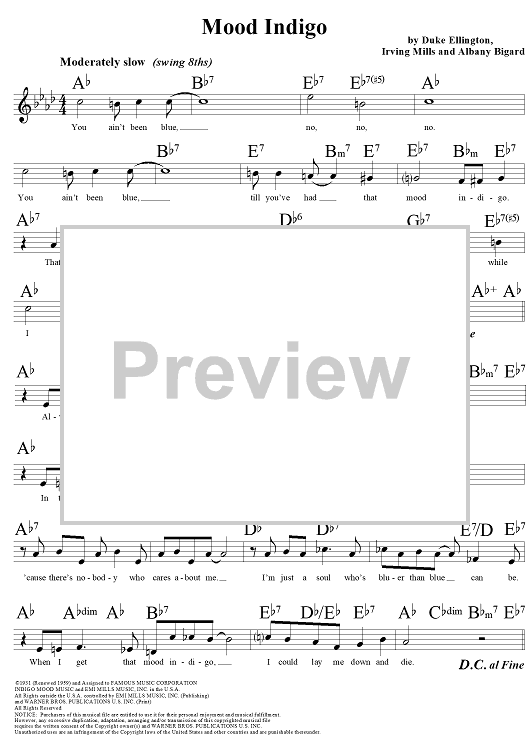 Digital Sheet Music for Mood Indigo by Duke Ellington, Irving Mills, Barney Bigard scored for Lead Sheet; id:109208